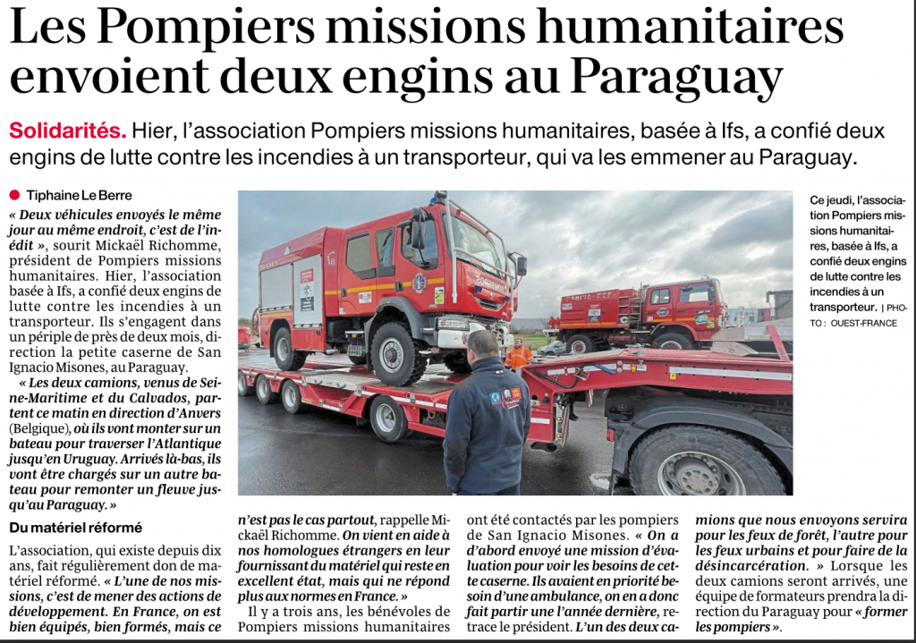 2026 - PARAGUAY Les Pompiers missions humanitaires envoient deux engins au Paraguay février 17, 2026 David Lecomte
